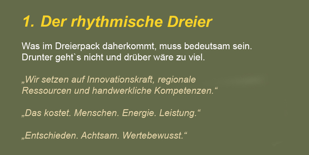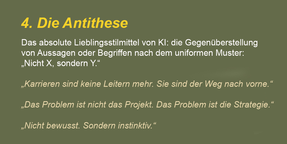 Die Geschmacksrichtung – also der sachliche Inhalt eines Textes – ist eigentlich egal. Was unangenehm aufstößt, ist der übermäßige Anteil bestimmter stilistischer Elemente. KI-generierte Texte sind in ihrer ursprünglichen Form immer überwürzt. Und das mit nur einer Handvoll unterschiedlicher Gewürze. Dabei gibt es fast 200 rhetorische Stilmittel, mit denen sich Sprache vielfältig gestalten lässt. Gerade im Fall der Künstlichen Intelligenz verwundert es, dass ein ansonsten so leistungsfähiges Instrument in seiner Gestaltungs- und Ausdrucksweise so reduziert ist. Die Ursache dafür liegt natürlich in der Natur von Sprachmodellen – von wegen Häufigkeiten und Wahrscheinlichkeiten und dass KI auch nur das ausspuckt, was sie vorher gefressen hat. Aber das soll hier nicht das Thema sein.