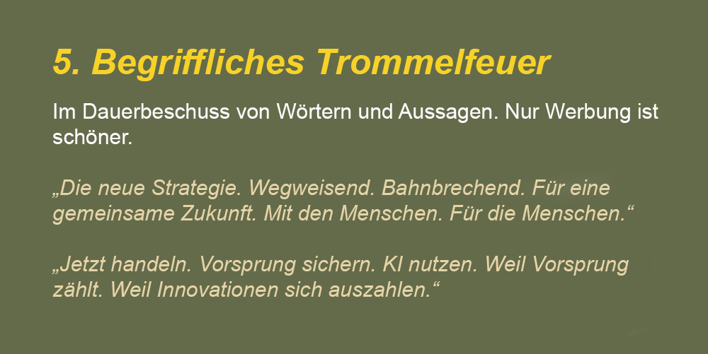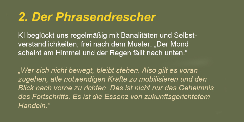 Es gibt noch weitere Stilmittel, ohne die KI einfach nicht kann. Die hier genannten sind aber die augenscheinlichsten – und nervigsten. Denn jedes einzelne Stilmittel ist schon für sich genommen ein Verstärker. Es dient dazu, Wörter und Aussagen zu betonen. In ihrer Kombination und ständigen Wiederholung machen die Stilmittel dann selbst aus banalsten Inhalten schreiende Marketingtexte. Oder anders gesagt: Wo Künstliche Intelligenz Sprache befruchtet, wird alles bedeutungsschwanger. Die schnelle Geburt ist allerdings ein hoher Preis für die farblosen Zöglinge, die man erhält. Auf den ersten Blick erscheinen sie noch recht passabel. Auf den zweiten sollte man aber erkennen, dass es Klone sind. Wie auch immer, herzlichen Glückwunsch den Erzeugern – bzw. den Bestellern, denn eigentlich sind es Adoptivkinder.