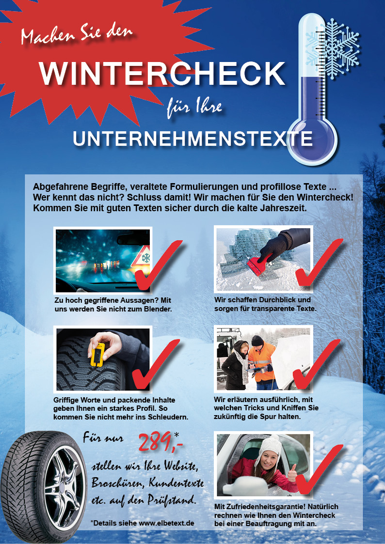 Machen Sie einen Wintercheck! Lassen Sie Ihre Unternehmenstexte von einer zertifizierten Textwerkstatt überprüfen. Ob Website, Broschüren, Flyer oder Kundenkorrespondenz – Der Profi erkennt schnell, ob Ihre Kommunikation noch sicher und zeitgemäß ist.